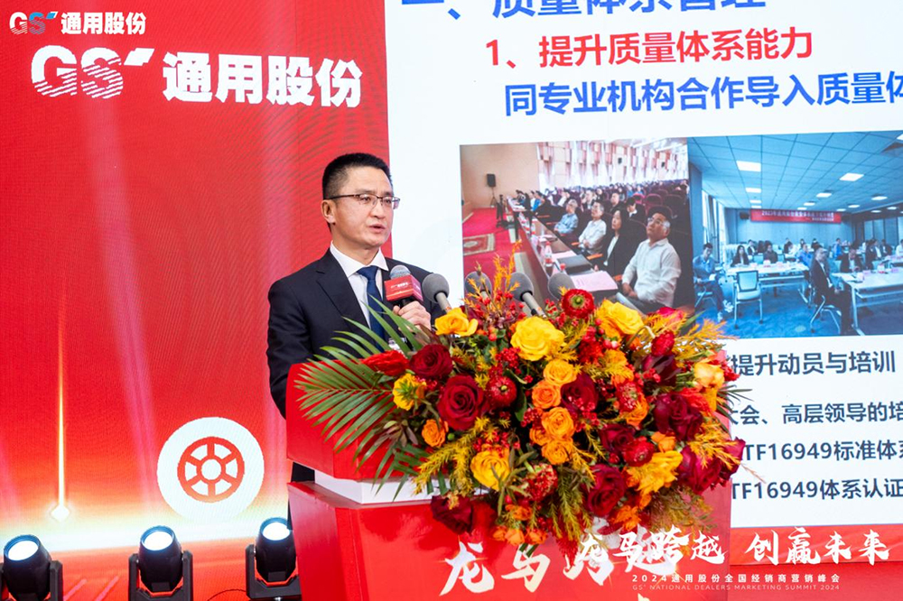 因勢而謀,順勢而為;前瞻布局,方能遠行。通用股份董事長顧萃做總結講話,感謝經(jīng)銷商朋友們長期以來和通用股份的攜手共進和互相支持。他強調(diào)在周期突變要做好戰(zhàn)略謀劃,保持戰(zhàn)略定力,增強發(fā)展信心。近年來公司加速產(chǎn)業(yè)轉型升級,成功打造海外雙基地、國內(nèi)半鋼“黑燈車間”、全鋼“5G碳云工廠”高端智造模式引領行業(yè)升級,2023年通用股份營業(yè)收入、全球銷量和盈利能力實現(xiàn)新增長。展望2024,公司將重點“打造三項工程、錘煉五種能力”,即品牌工程、人才工程、5X基地工程,研發(fā)能力、營銷能力、制造能力、降本能力、組織能力,強基固本激發(fā)活力,加速“百億通用”步伐,與各位經(jīng)銷商堅定信心、龍馬跨越,緊咬目標不放松,開啟高質(zhì)發(fā)展新征程!