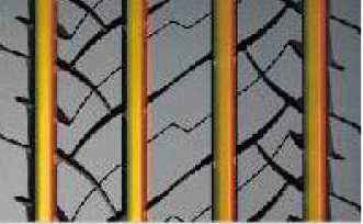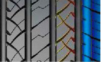 增加胎面的咬合邊,提高剎車和濕地安全性能。切割花紋防止花紋塊在剎車時(shí)發(fā)生卷邊效應(yīng),增大接地面積。